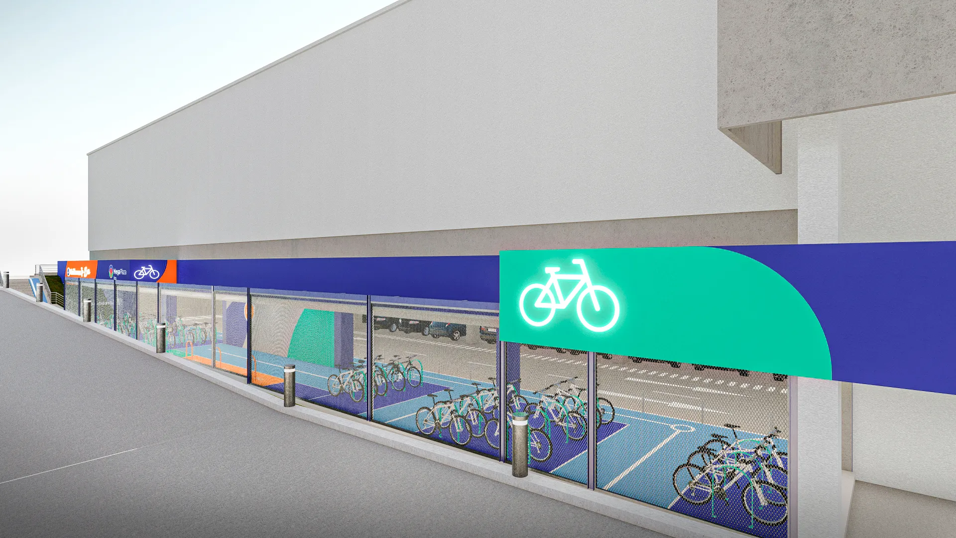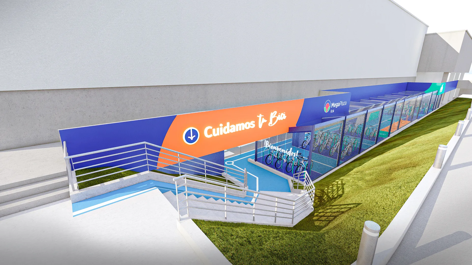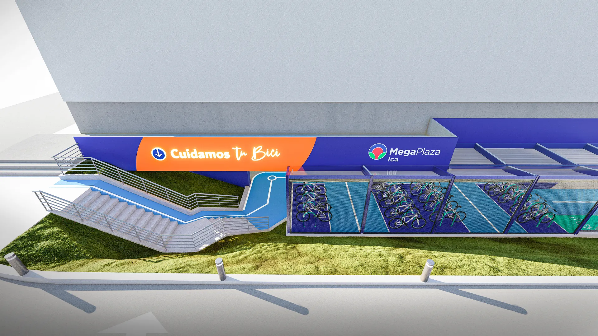 Como parte del rebranding de Mega Plaza, diseñamos un estacionamiento de bicicletas que transforma un área vehicular en un espacio moderno y seguro para ciclistas. Inspirado en el diseño vial urbano, incorporamos señalización clara, un techo protector y rejas de acero perforado que garantizan seguridad sin comprometer la visibilidad. Además, utilizamos un sistema de pintura en las rejas para guiar intuitivamente a los usuarios y mejorar la orientación dentro del mall. Con esta intervención, no sólo optimizamos la funcionalidad del espacio, sino que también reforzamos su presencia y accesibilidad, integrándose de manera estratégica en la experiencia del centro comercial.