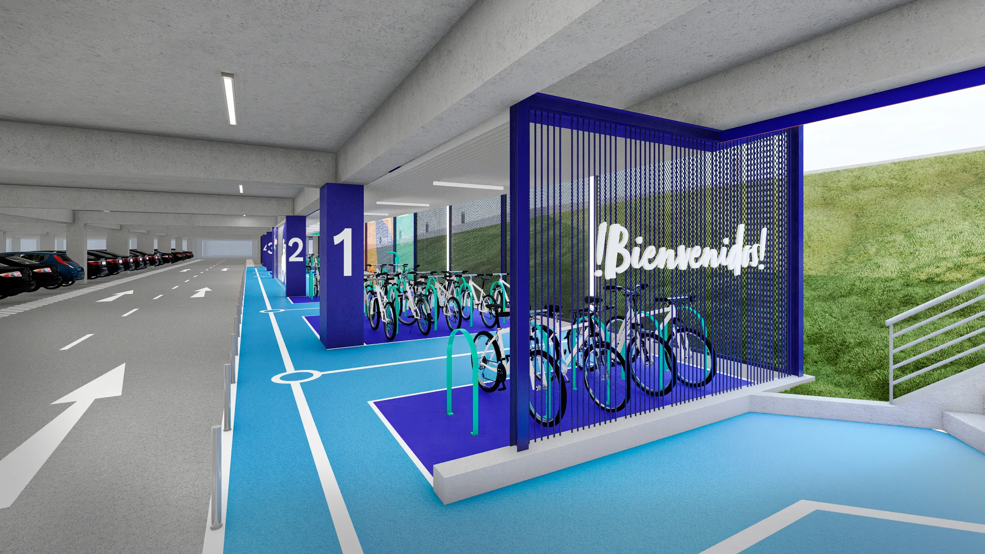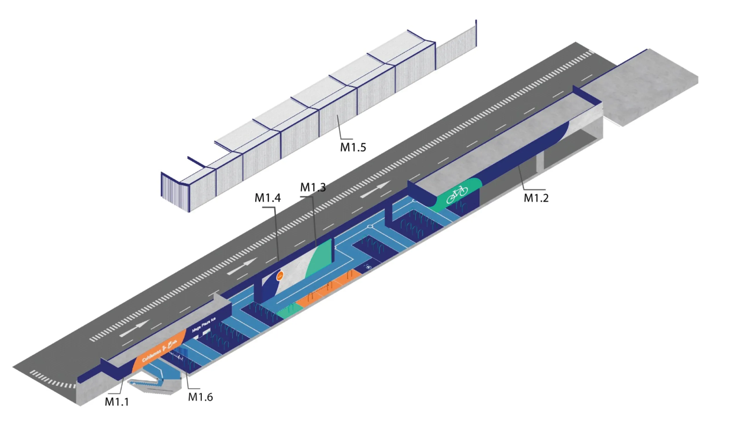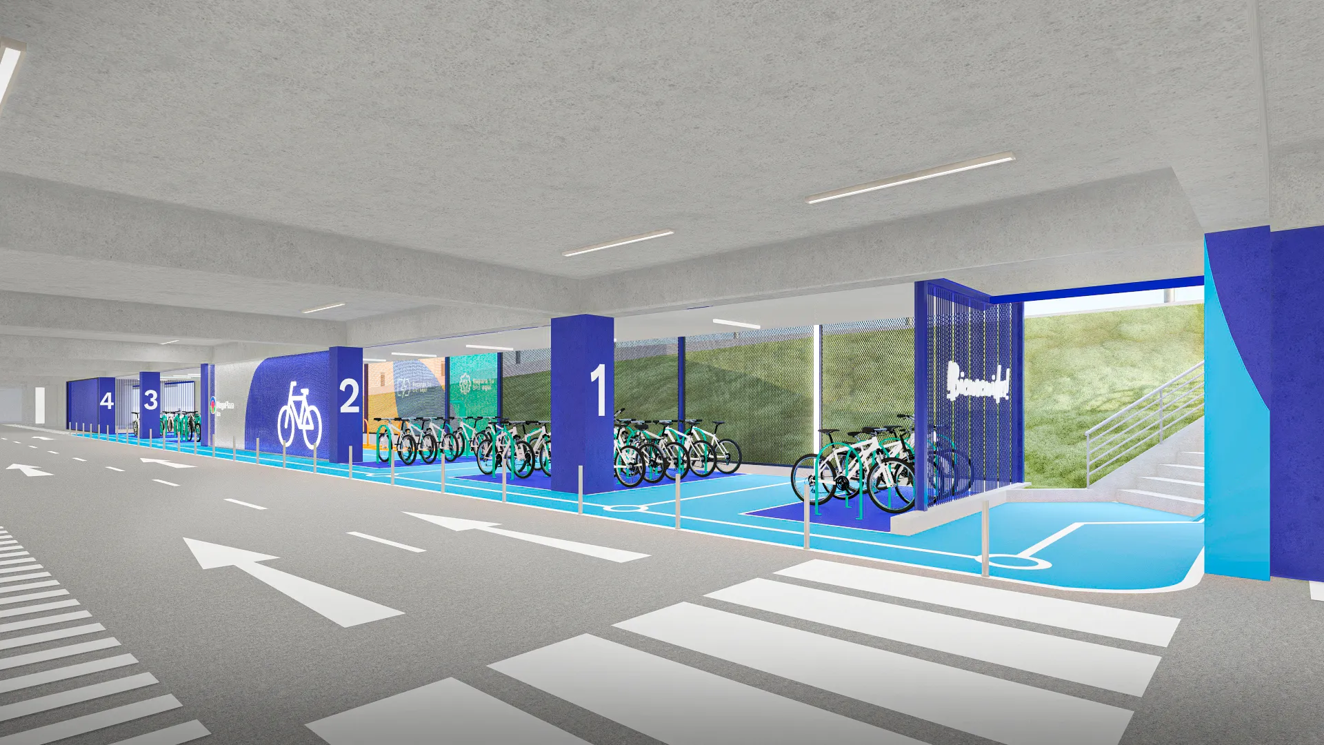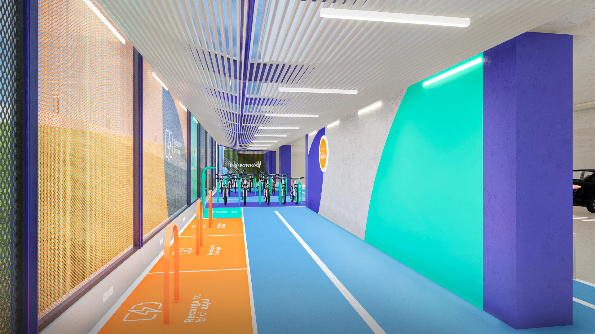 Como parte del rebranding de Mega Plaza, diseñamos un estacionamiento de bicicletas que transforma un área vehicular en un espacio moderno y seguro para ciclistas. Inspirado en el diseño vial urbano, incorporamos señalización clara, un techo protector y rejas de acero perforado que garantizan seguridad sin comprometer la visibilidad. Además, utilizamos un sistema de pintura en las rejas para guiar intuitivamente a los usuarios y mejorar la orientación dentro del mall. Con esta intervención, no sólo optimizamos la funcionalidad del espacio, sino que también reforzamos su presencia y accesibilidad, integrándose de manera estratégica en la experiencia del centro comercial.