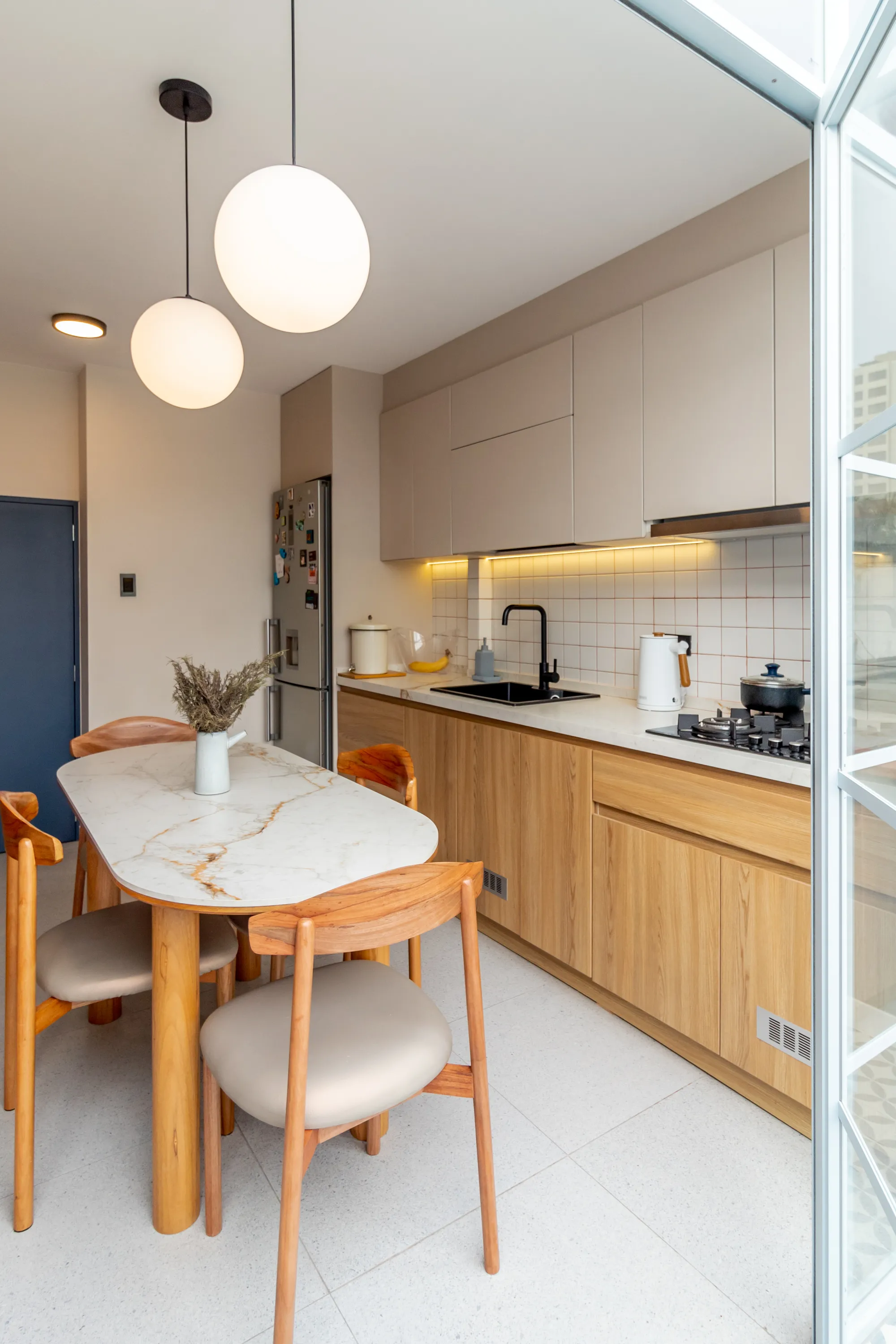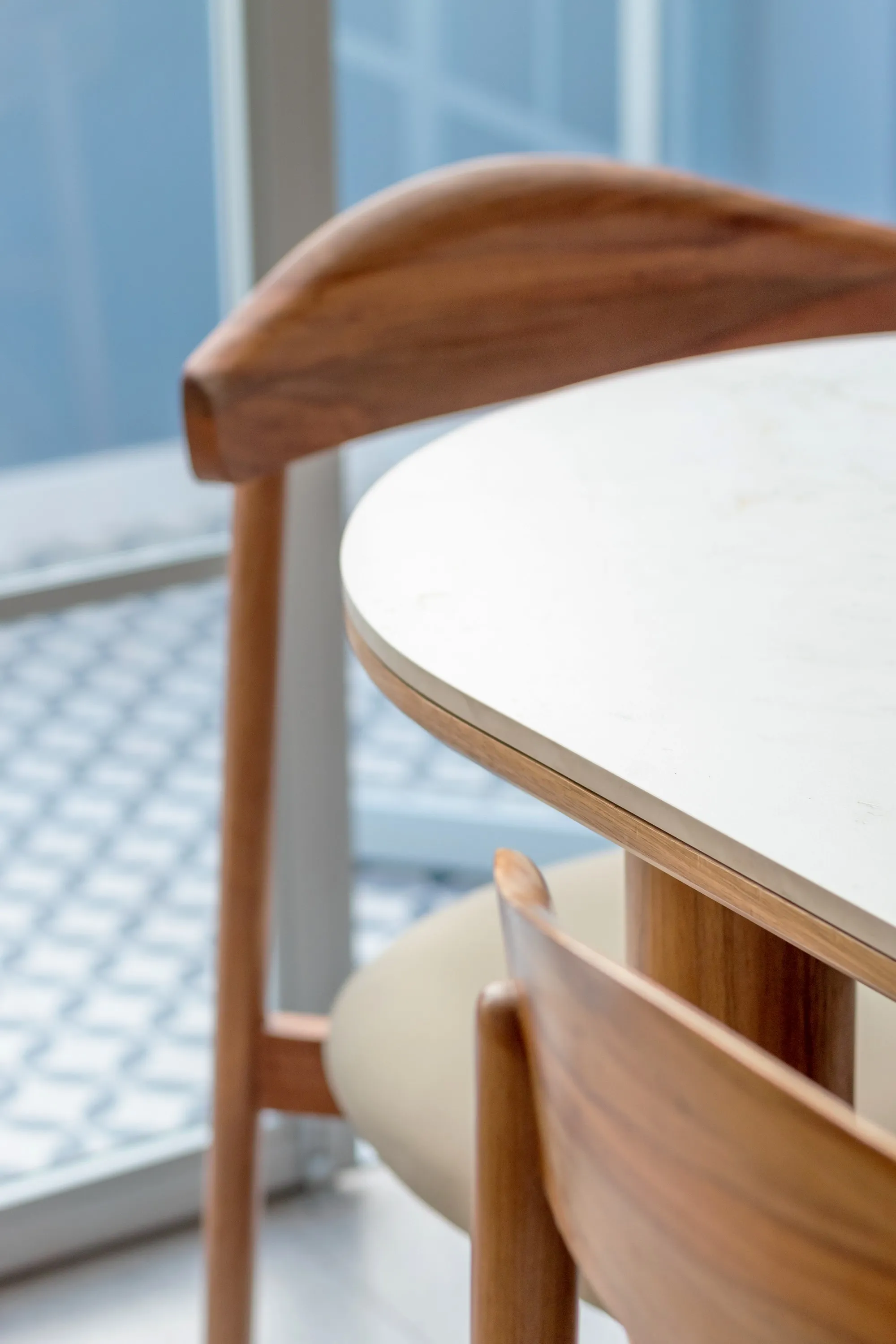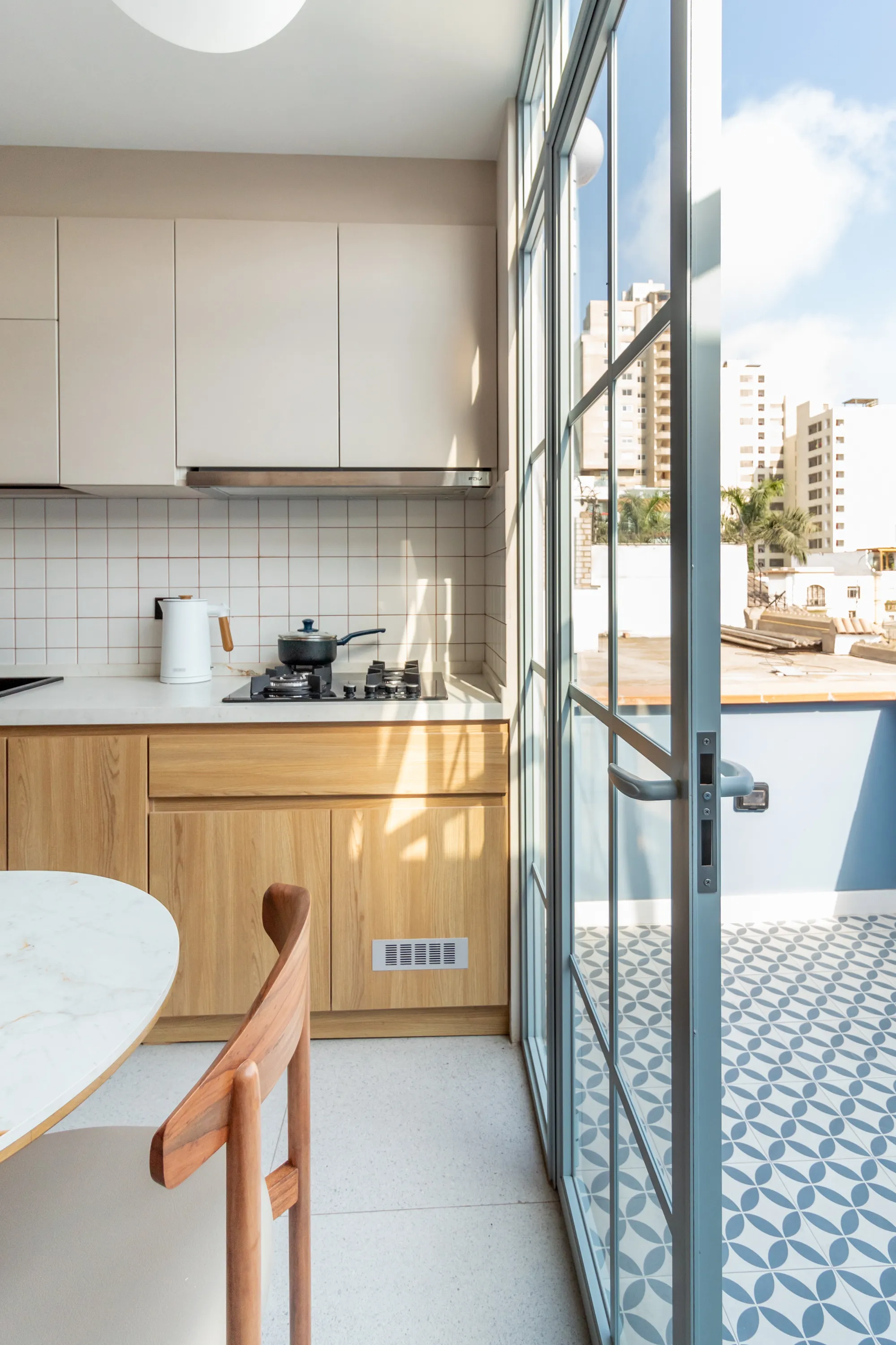 La propuesta se materializa en una terraza luminosa, donde tonos arena y beige dialogan con azules suaves, madera natural, detalles en piedra y luz cálida, creando una atmósfera serena y acogedora, alineada con la forma en que Patty disfruta el acto doméstico.